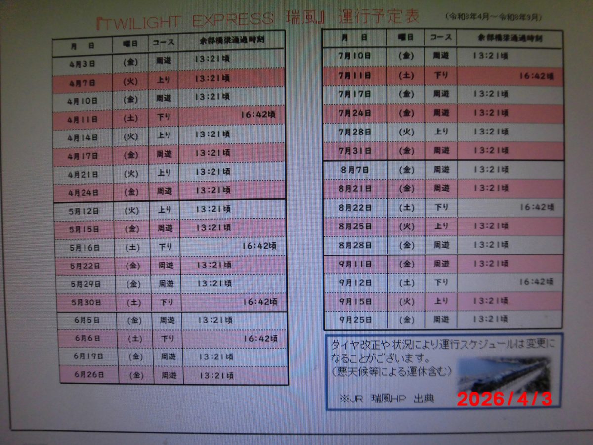 「TWYLIGHT瑞風」の運行予定をお知らせいたしますお知らせ / 2026/04/03 令和8年4月から令和8年9月までの「TWILIGHT EXPRESS 瑞風」の余部橋梁通過予定時刻をお知らせします。タイミングが合えばご覧いただけます。尚、気象条件などにより遅延する場合がございます。